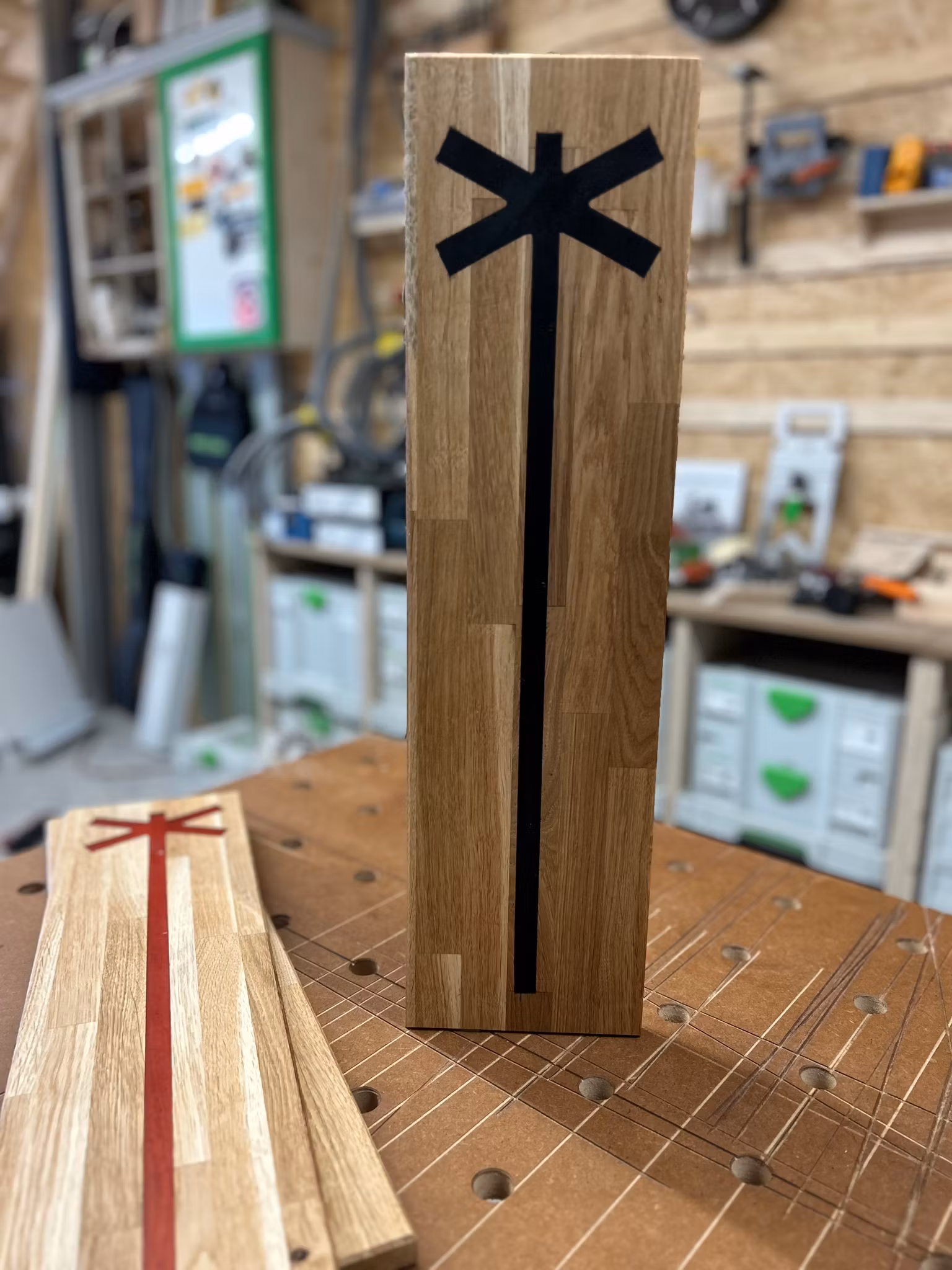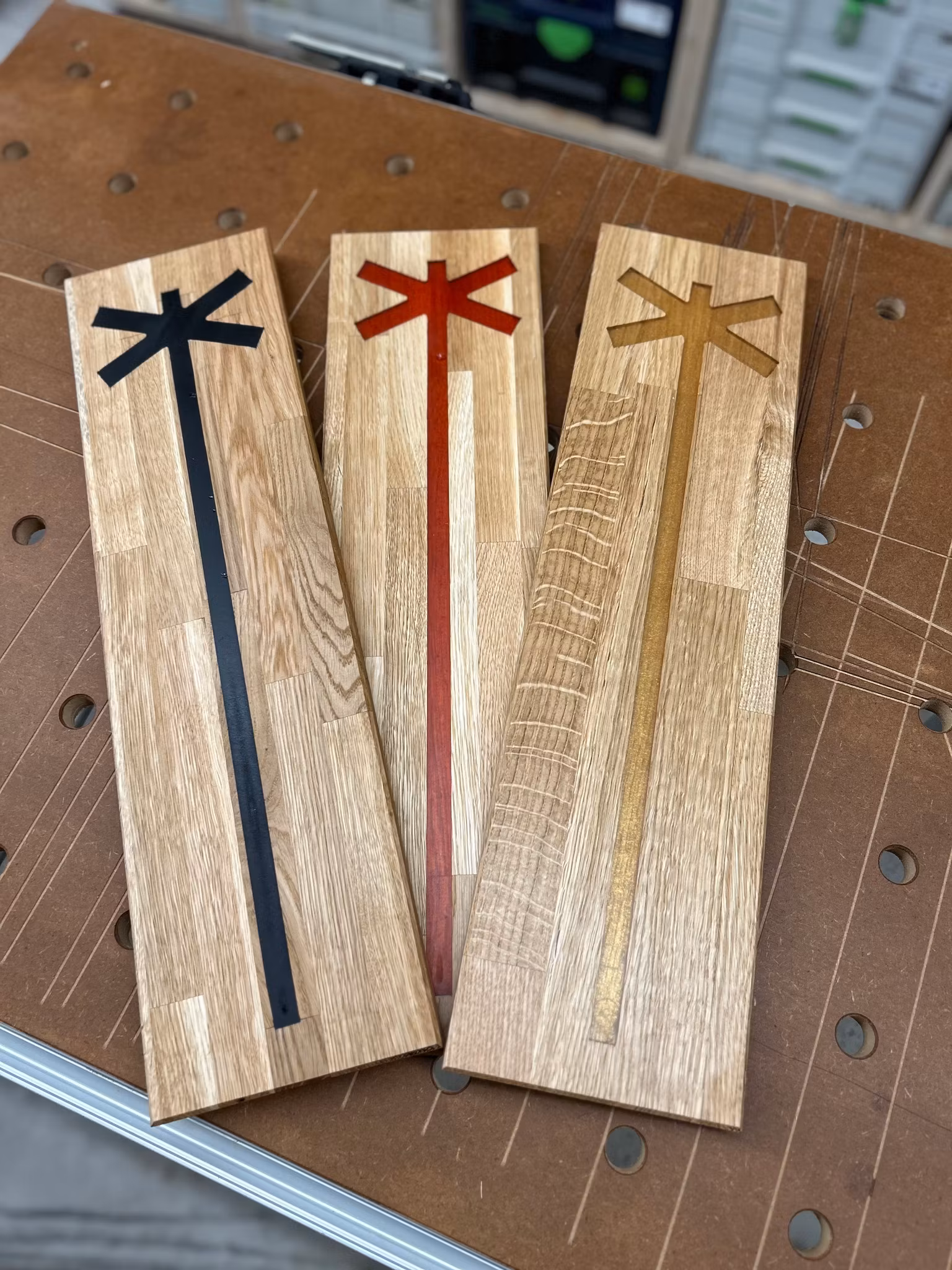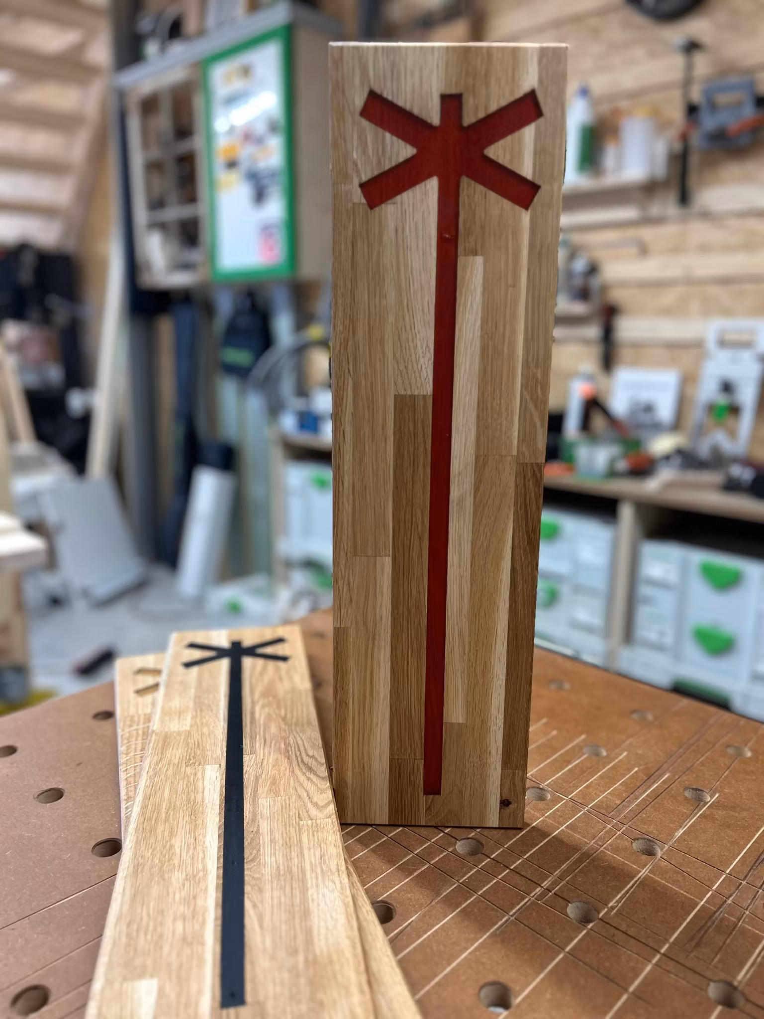 Tillverkad i ek och ett fräst ledkryss fyllt med epoxy.